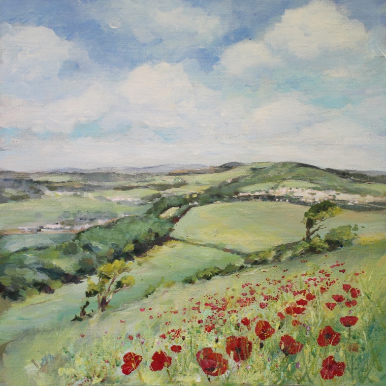 framed acrylic painting image size 40x40cmThe poppies on Culver Down between Bembridge and Sandown, Isle of Wight make a wonderful subject for this acrylic landscape painting.