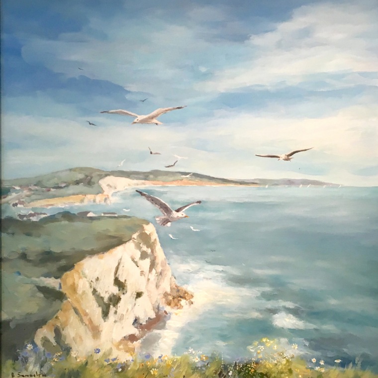 An oil seascape painting image size 40x40cm framedAn inspiring part of the Isle of Wight coast depicting the cliffs on Tennyson Down and the beach beyond Freshwater Bay