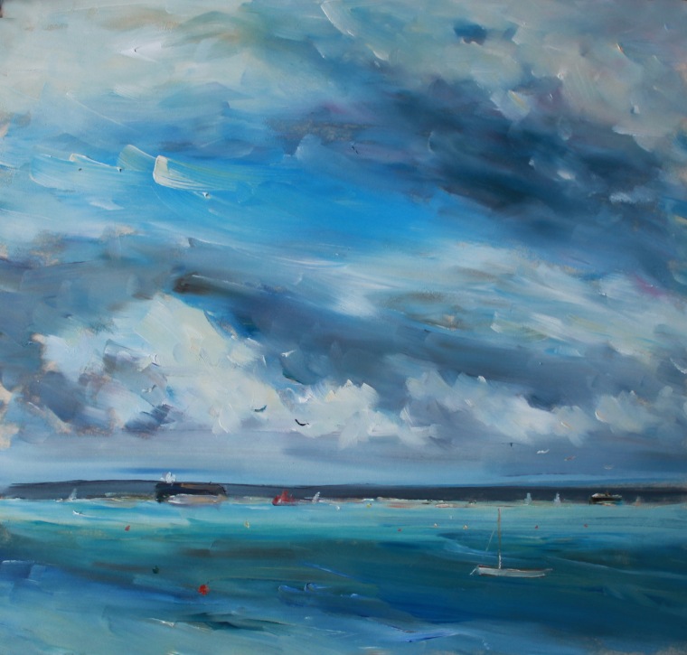 Unframed oil painting 23x25cmWonderful day off Seaview with fast moving clouds and light on the water.